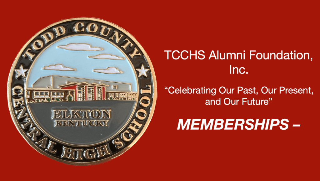 We invite all interested individuals to become involved in the TCCHS Alumni Association / Foundation either as a graduate of TCCHS or as a friend of our organization. Memberships are either $10.00 yearly or $200.00 lifetime. A yearly membership can be contributed at any point during a calendar year. However, to make renewals easier, we suggest renewing during your birthday month. Obviously, lifetime memberships can also be made at any time someone chooses. Please note those nearly 50 alumni who joined the TCCHS Alumni Association in years past will have their lifetime memberships “grandfathered” into the TCCHS Alumni Foundation, Inc. All memberships help fund our scholarship efforts and other items we purchase and sell to generate monies for our scholarship efforts. Checks can be made out to TCCHS Alumni Foundation. Our mailing address is P.O. Box 611, Elkton, KY 42220.
